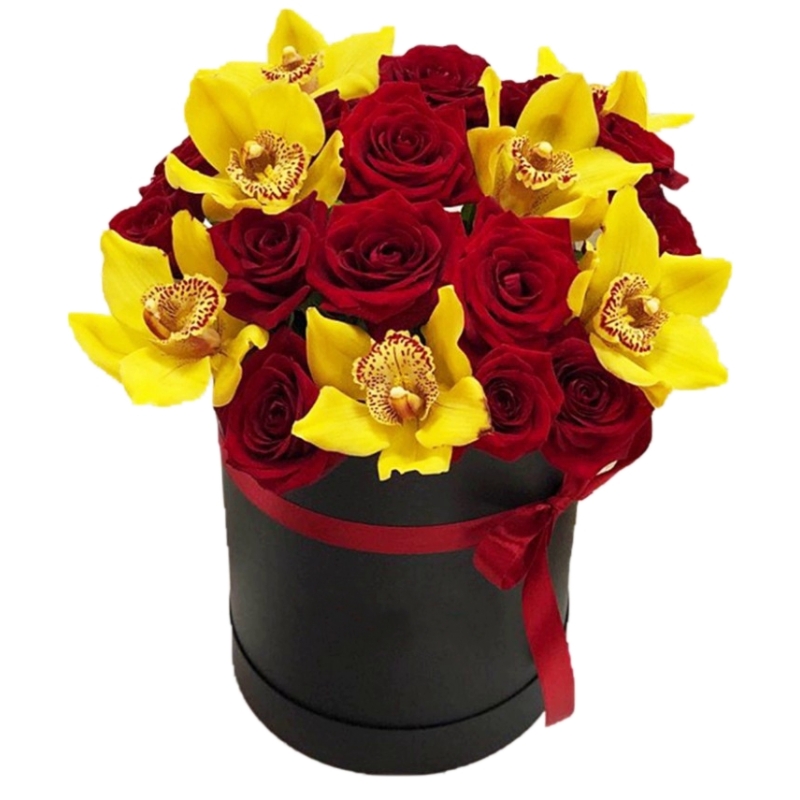Букет состоит из 17 красных роз, 7 орхидей, коробка, оазис, атласная лента.
