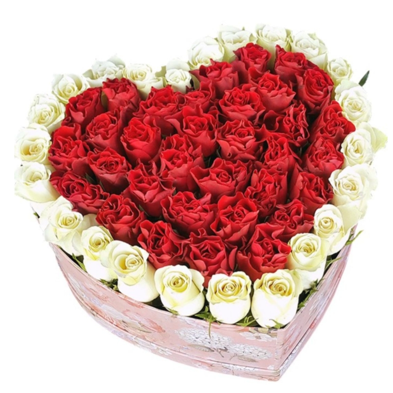 51 красная и белая роза, коробка в виде сердца.